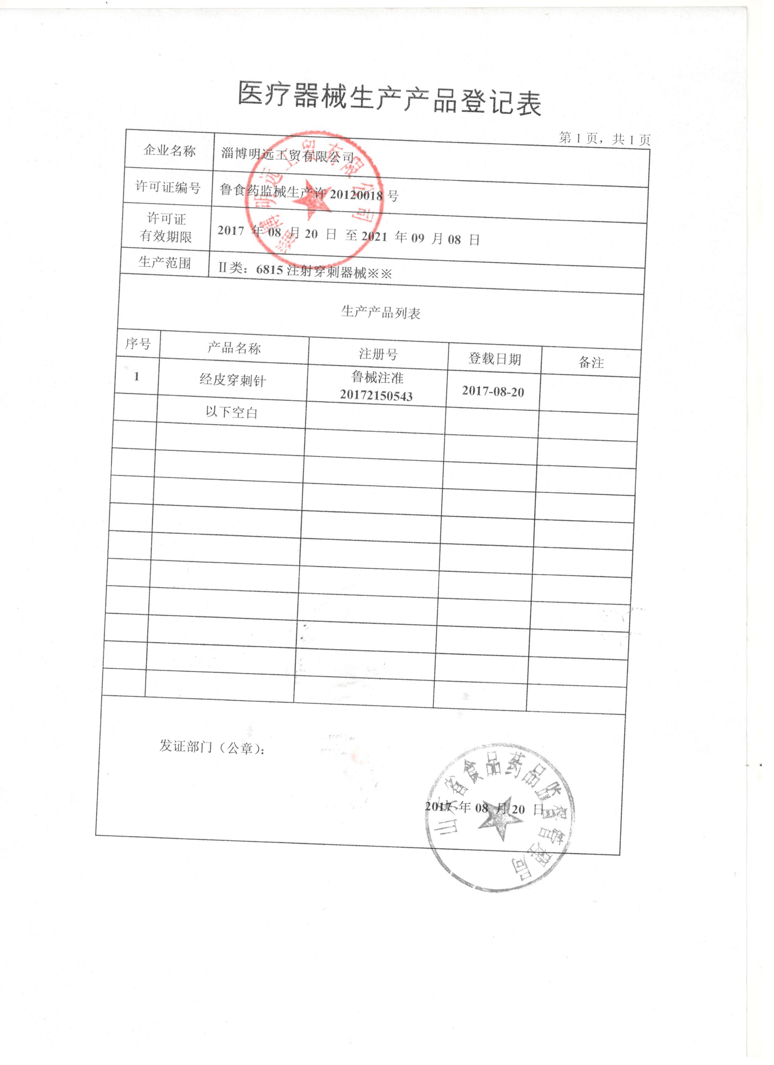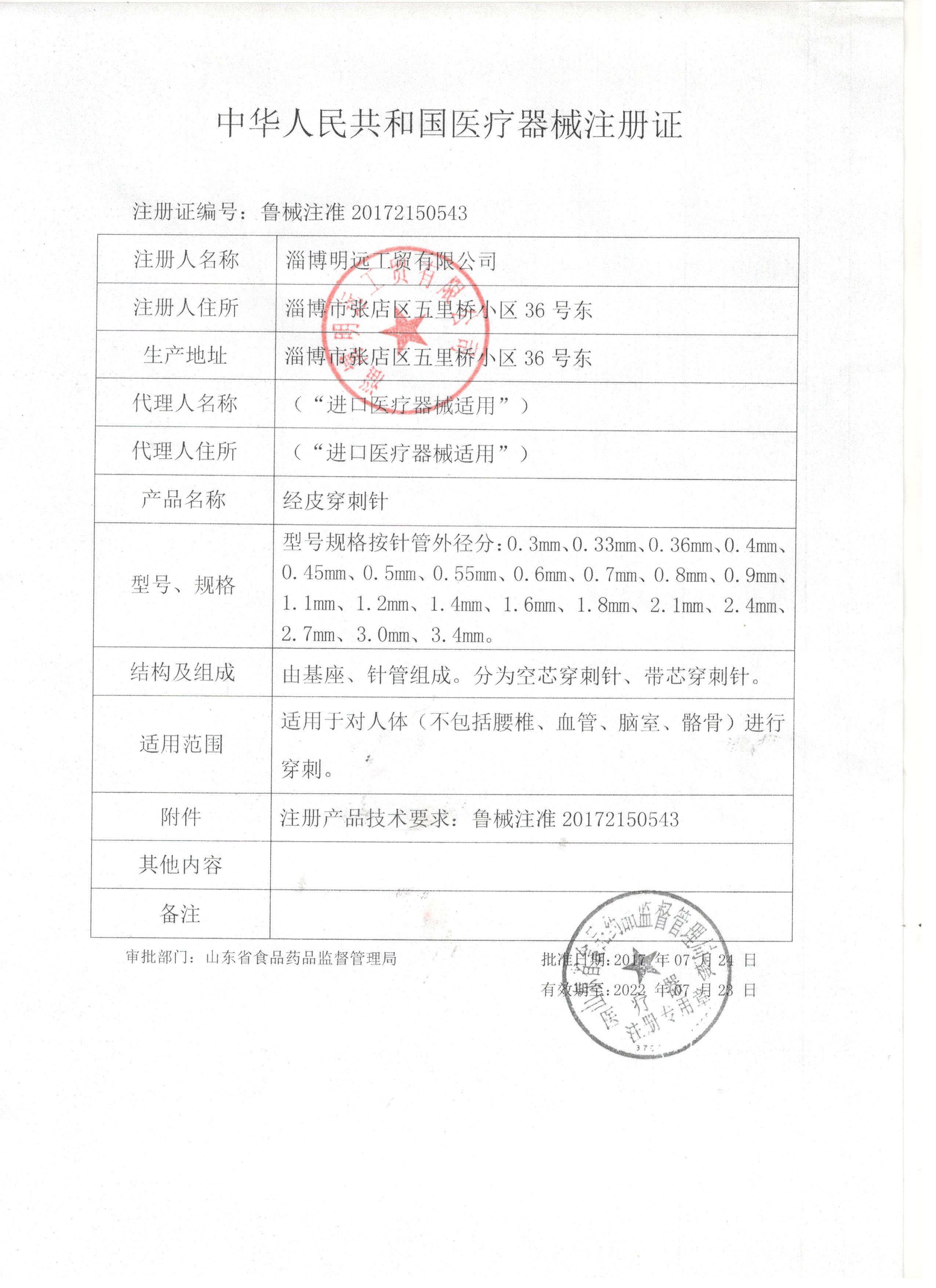 淄博明遠(yuǎn)工貿(mào)有限公司 公司成立于2000年,是二類醫(yī)用穿刺器械專業(yè)生產(chǎn)廠家。公司以微創(chuàng)手術(shù)器械為發(fā)展方向,產(chǎn)品以各類特種穿刺針為主。我們以全方位的管理手段,嚴(yán)格地控制產(chǎn)品品質(zhì).歡迎您選用我公司產(chǎn)品并對(duì)我們的產(chǎn)品提出建設(shè)性的建議和意見.我們?cè)敢獬蔀槟玫纳饣锇楹椭呐笥选?